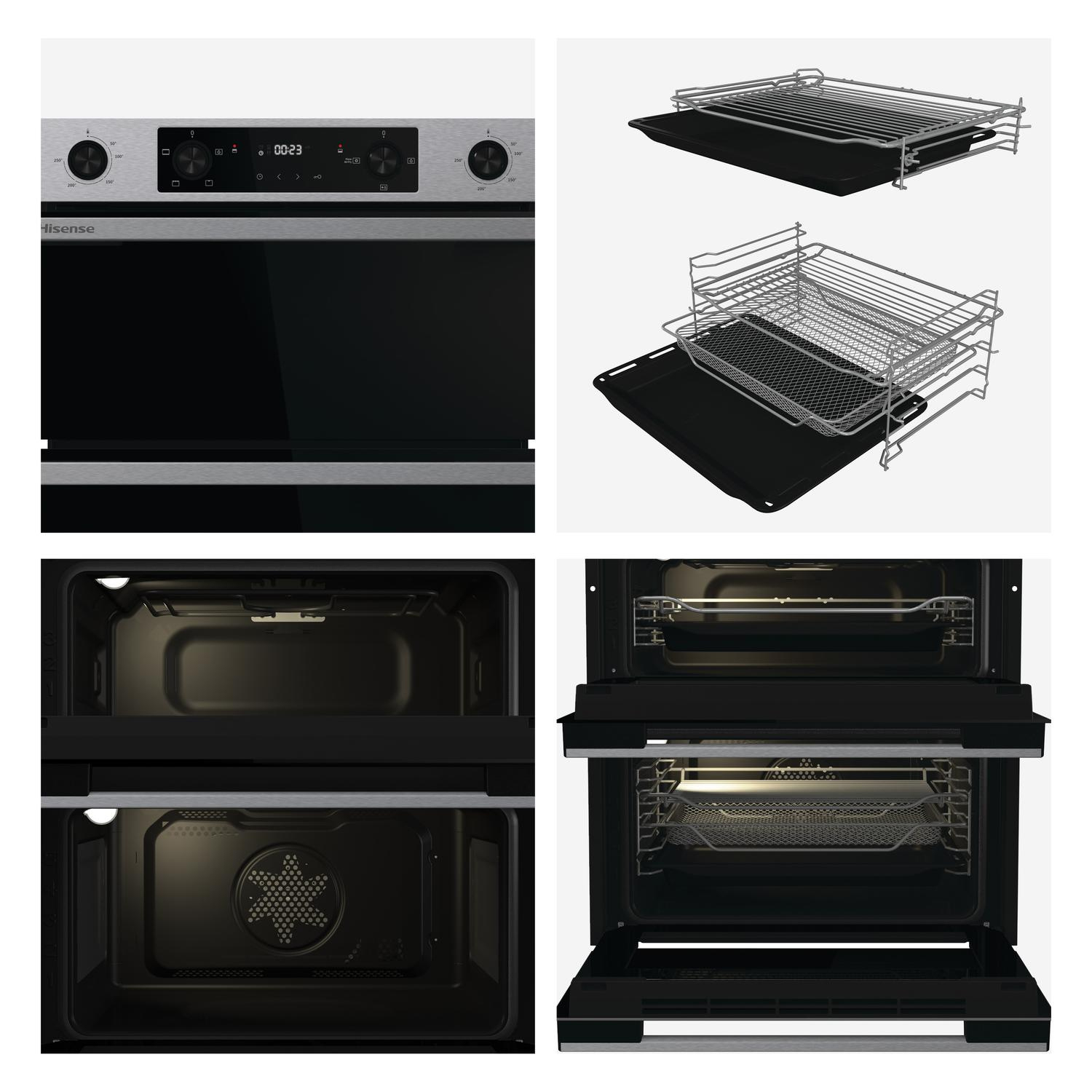 Discover the Hisense BUD714221CX, a built-under electric double oven featuring dual cavities with a total capacity of 92 litres—38 litres in the upper and 54 litres in the lower compartment. This model utilises a main electric fan oven to ensure uniform cooking throughout each shelf, eliminating hot spots for perfectly prepared meals. Its integrated airfry function, equipped with a perforated tray, offers a healthier alternative to frying, making it an excellent addition for health-conscious users seeking versatility in the kitchen.