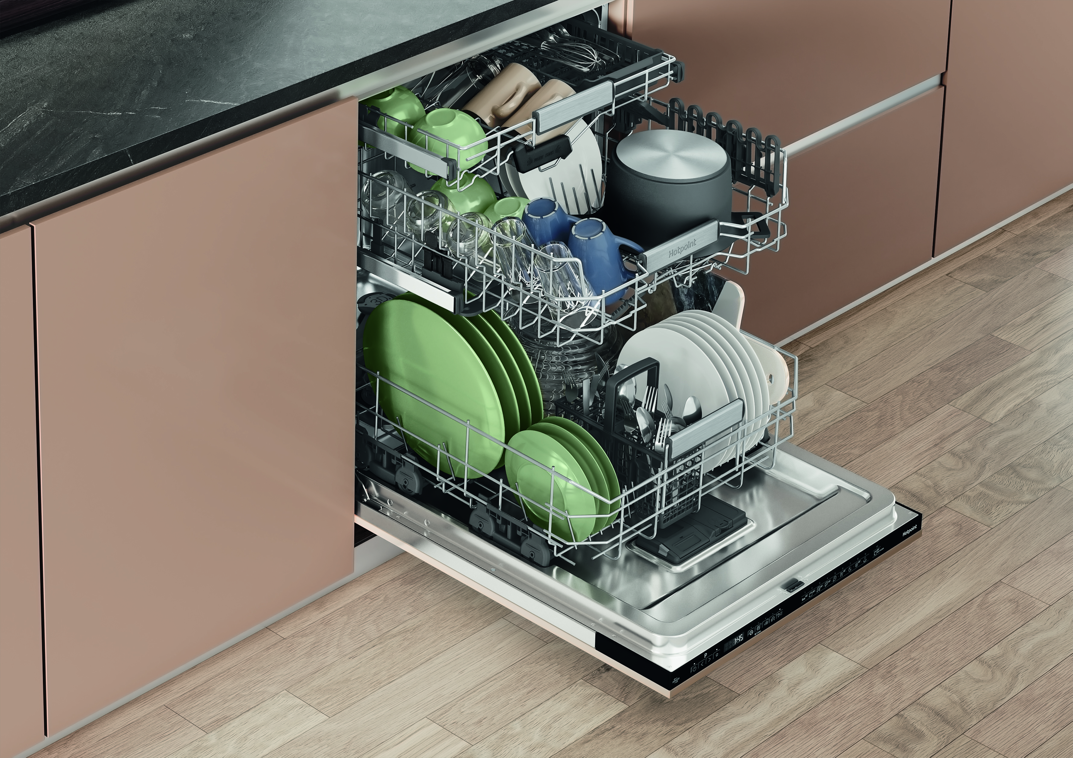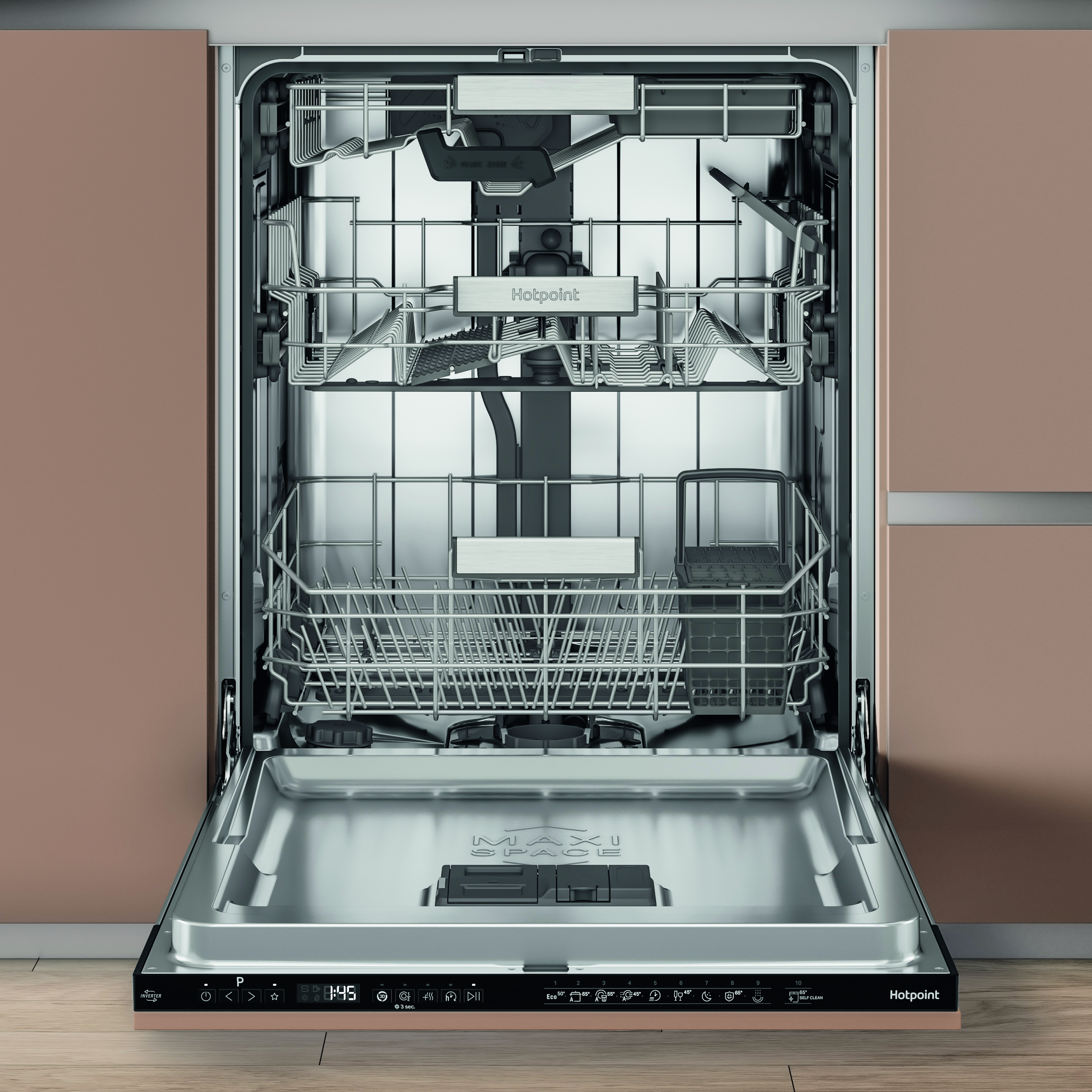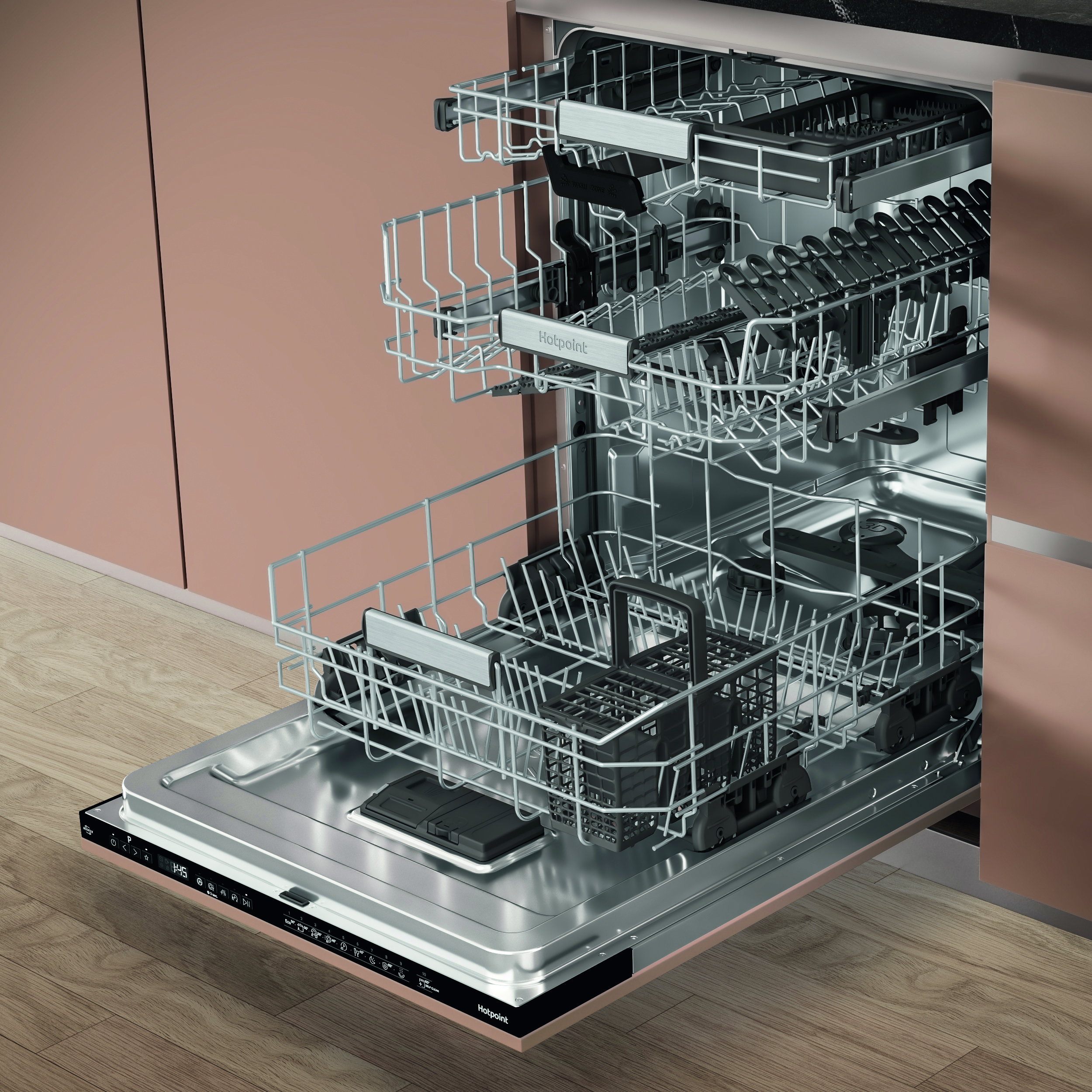 Skip the scrubbing and get a sparkling clean every time with the Hotpoint H8I HP42 L UK built in dishwasher. The large 14 place setting dishwasher includes the new Hydroforce 3rd rack the first on the market* with integrated spray jets**, giving you 100% coverage. You also get 10%*** more usable space thanks to the Maxi Space tub, so from the biggest Sunday roasts to a weekend of batch cooking, Hotpoint has you covered. Baked on food like lasagne is no problem for 3D Zone Wash, which gives you 80%**** more power, so all your crockery comes out sparkling. Achieve better drying results with ActiveDry it opens the door close to the end of the dishwashing cycle, so air can circulate for a natural dry