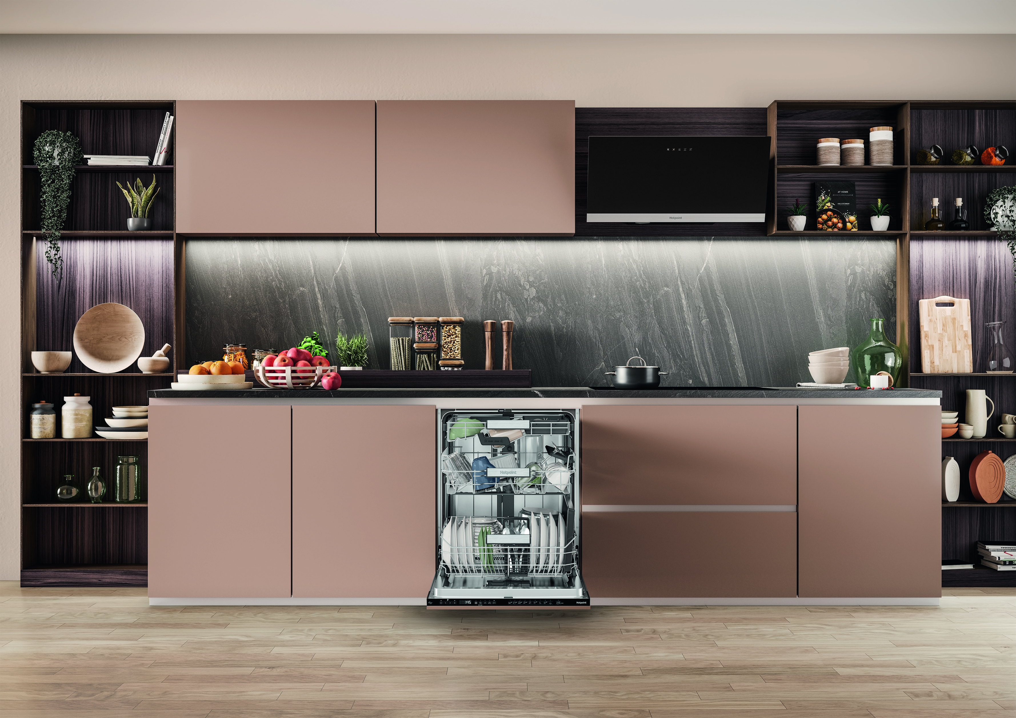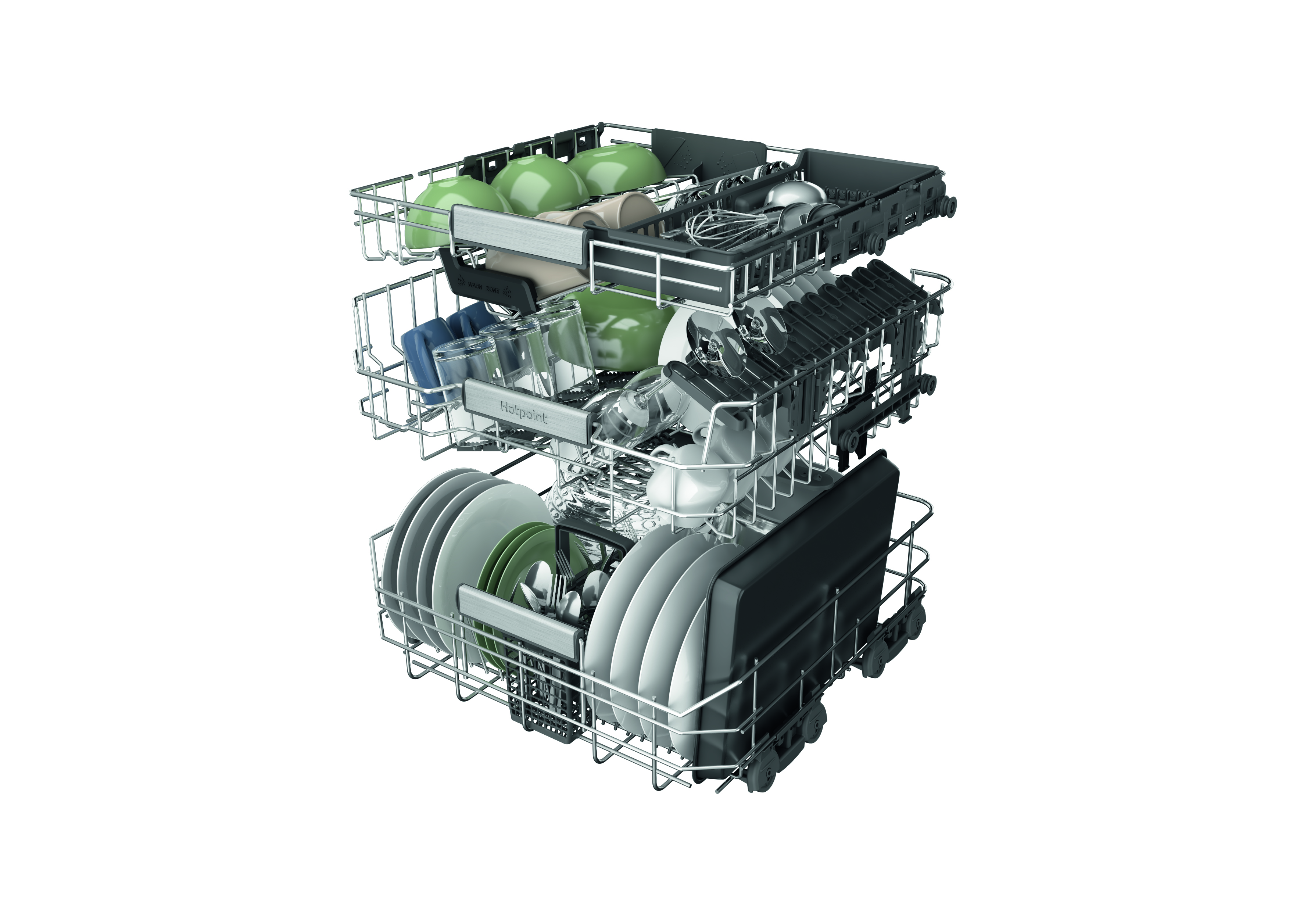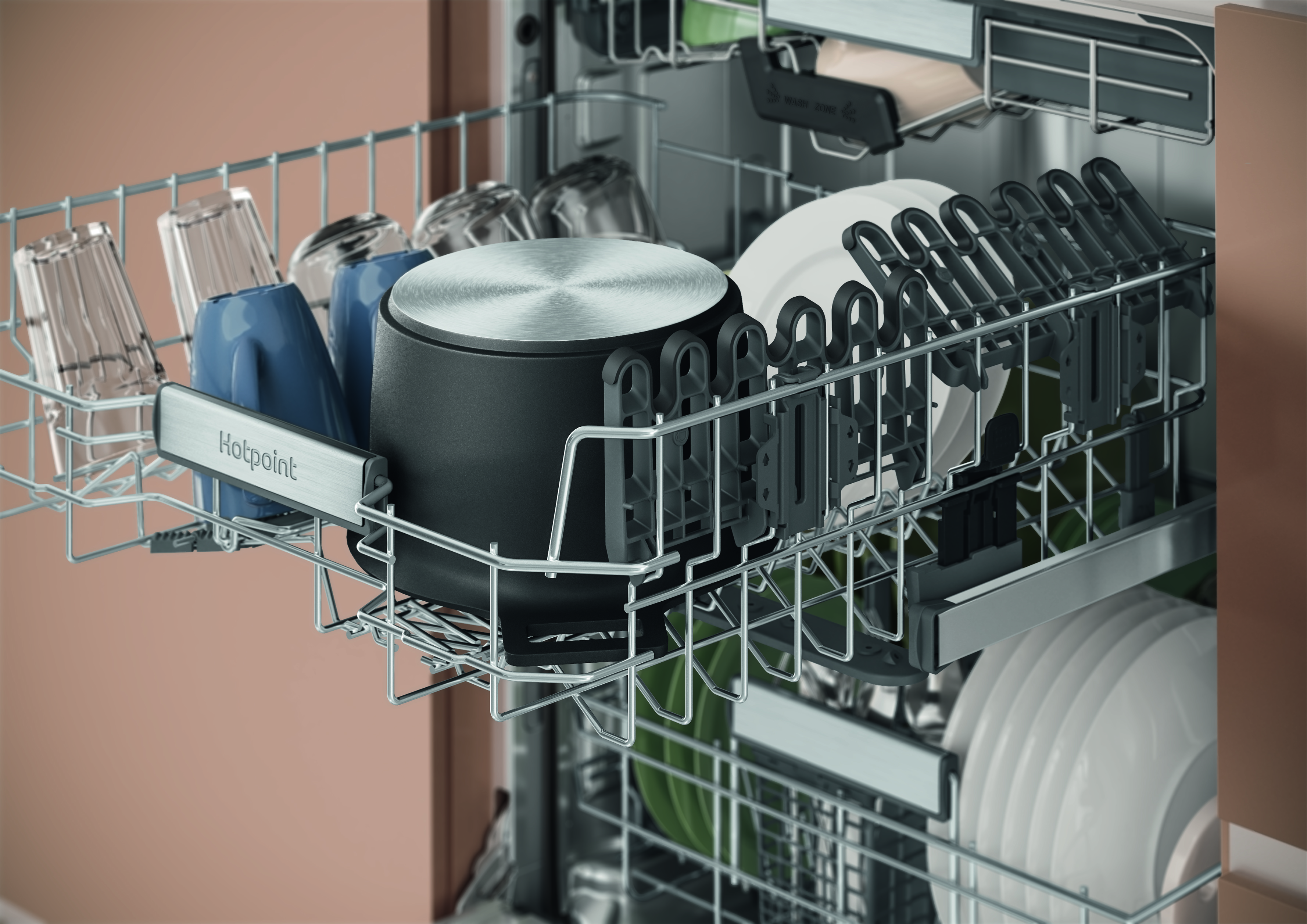 Skip the scrubbing and get a sparkling clean every time with the Hotpoint H8I HP42 L UK built in dishwasher. The large 14 place setting dishwasher includes the new Hydroforce 3rd rack the first on the market* with integrated spray jets**, giving you 100% coverage. You also get 10%*** more usable space thanks to the Maxi Space tub, so from the biggest Sunday roasts to a weekend of batch cooking, Hotpoint has you covered. Baked on food like lasagne is no problem for 3D Zone Wash, which gives you 80%**** more power, so all your crockery comes out sparkling. Achieve better drying results with ActiveDry it opens the door close to the end of the dishwashing cycle, so air can circulate for a natural dry