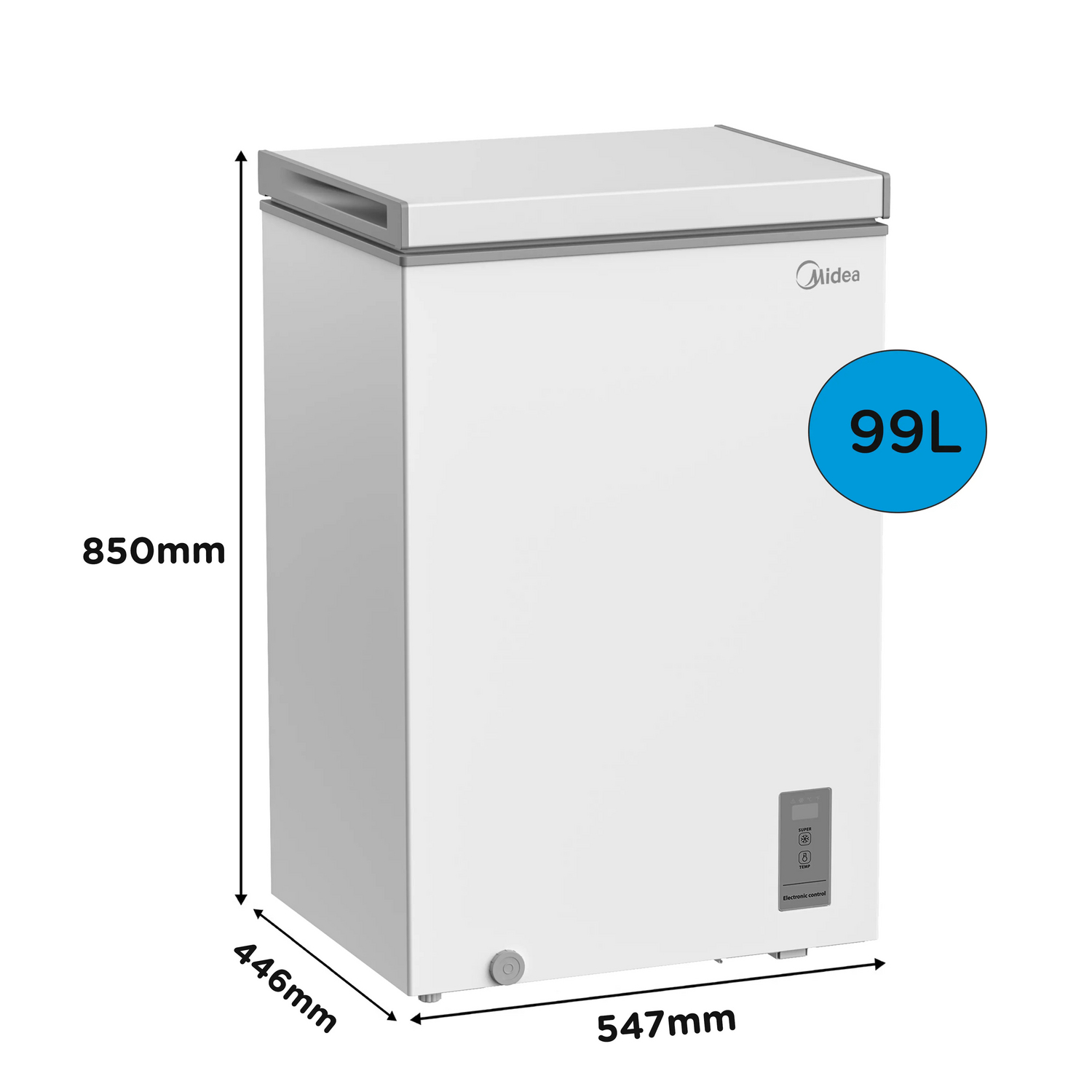 Discover reliable freezing power with the Midea MDRC154FZE01 99 Litre Chest Freezer, designed for efficient food preservation. Featuring an electronic control panel with a bright LED display, this freezer allows you to accurately monitor and adjust temperatures with ease, ensuring your stored items remain at the ideal coldness. The intuitive controls provide simplicity and precision, while the one-touch fast freeze function rapidly locks in food freshness, perfect for preserving newly added groceries.