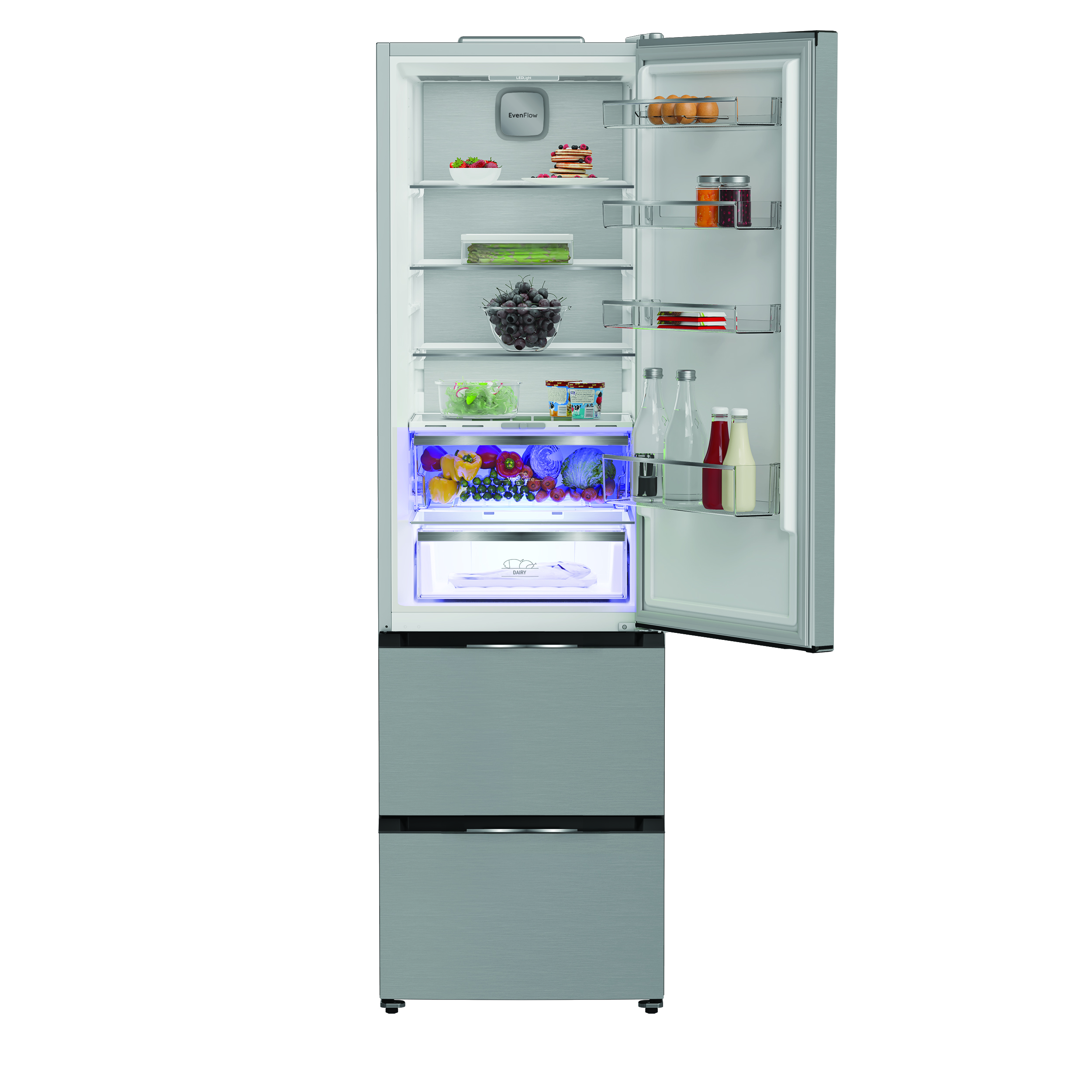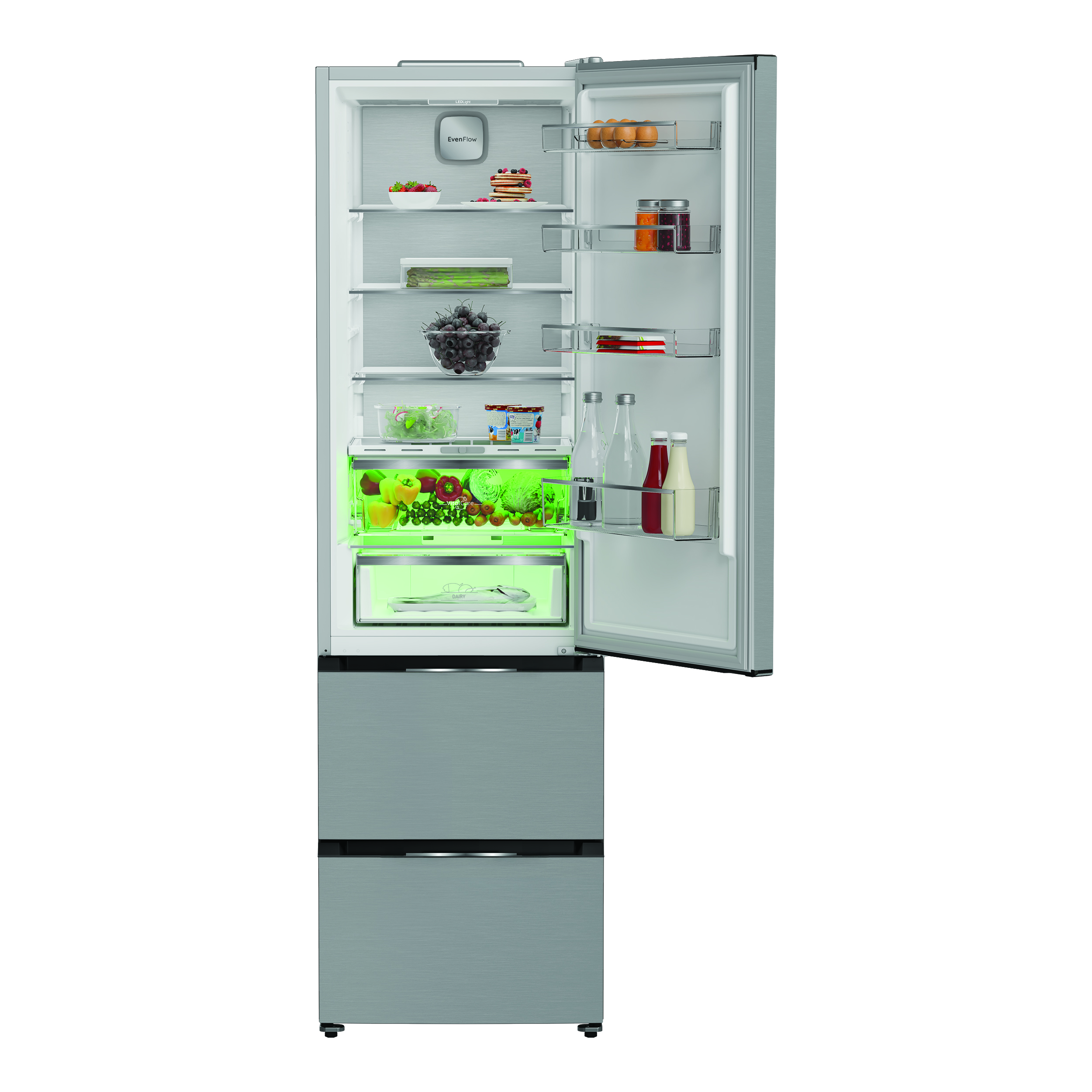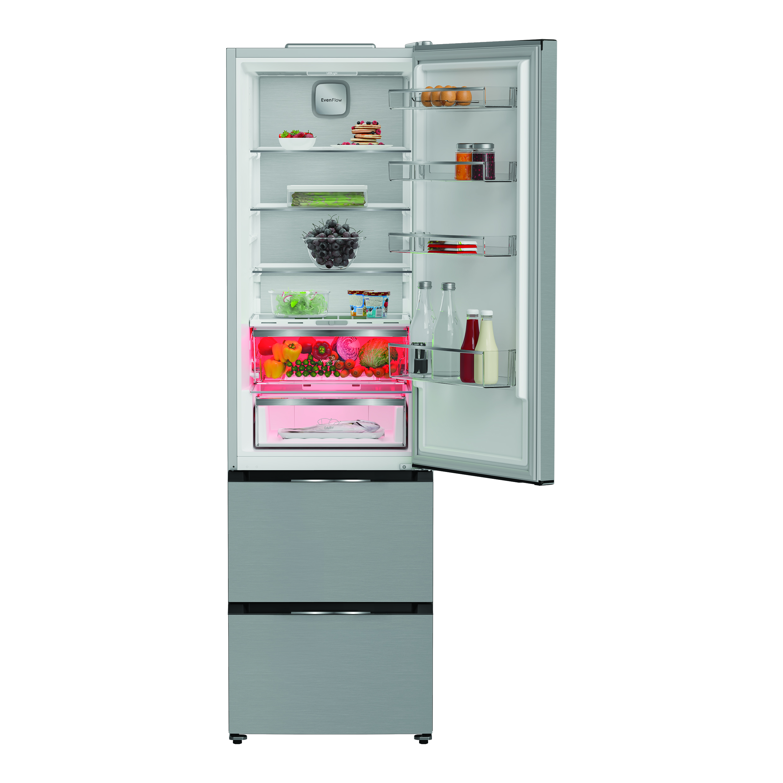 This super-stylish Hotpoint American 3-door fridge freezer, finished in brushed steel, is ready to stand out in any kitchen. With an extra-large capacity of 351L - enough for 20 shopping bags - it's perfect for fitting in a large weekly shop and when hosting friends and family. Thoughtful technology keeps food fresher for longer while helping cut down on waste. Dual No Frost ensures ice and moisture don°t build up in either the fridge or freezer, so you won°t need to manually defrost. And thanks to the quiet Inverter Compressor, the temperature stabilises quickly after every door opening ° helping to preserve food quality while using less energy. Inside the fridge, Even Flow cooling spreads air evenly across all shelves for consistent temperatures that keep ingredients crisp and tasty for up to 30% longer*. The dedicated VitalCare drawer makes use of gentle natural light to help fruit and veg stay fresher and full of nutritients for up to 7 days**. And the Fresh Shield compartment also ensures fresh food gets just the right amount of cooling and humidity to stay in perfect condition for longer***. With a Fast Freeze function for your new groceries and 90° door hinges that make it easy to install in tighter spots, this appliance fits around your kitchen ° and your life. *Weight loss and sensory evaluation tests used for the determination of shelf life were conducted internally by Beko Corporate on carrot, fresh-cut iceberg lettuce, fresh-cut tomato, strawberry, salami, and kashar cheese samples stored in the EvenFlow refrigerator and control refrigerator (without the EvenFlow technology) for a 12-day period. Actual results may vary based on food type and usage conditions. **Tested by Intertek for fruits and vegetables (blueberry, yellow pepper, tomato, parsley) directly exposed to the light technology compared to a refrigerator without the same technology installed (and compared to Day 0) over a 7-day period while preserved in the crisper. ***According to internal tests conducted by Beko Corporate on fresh lettuce, ProFresh crisper technology can preserve freshness longer compared to standard crisper based on the K70561 cabinet.
