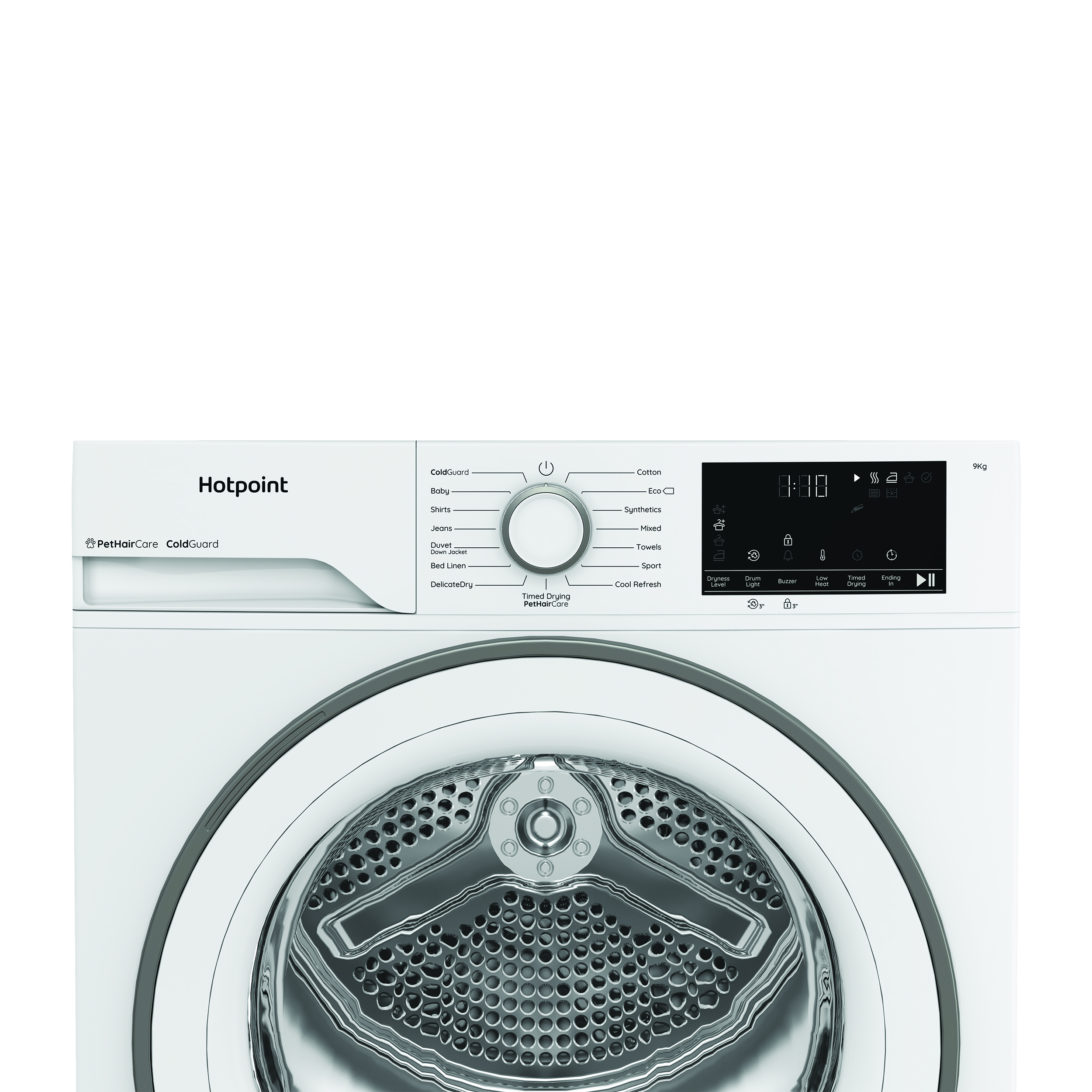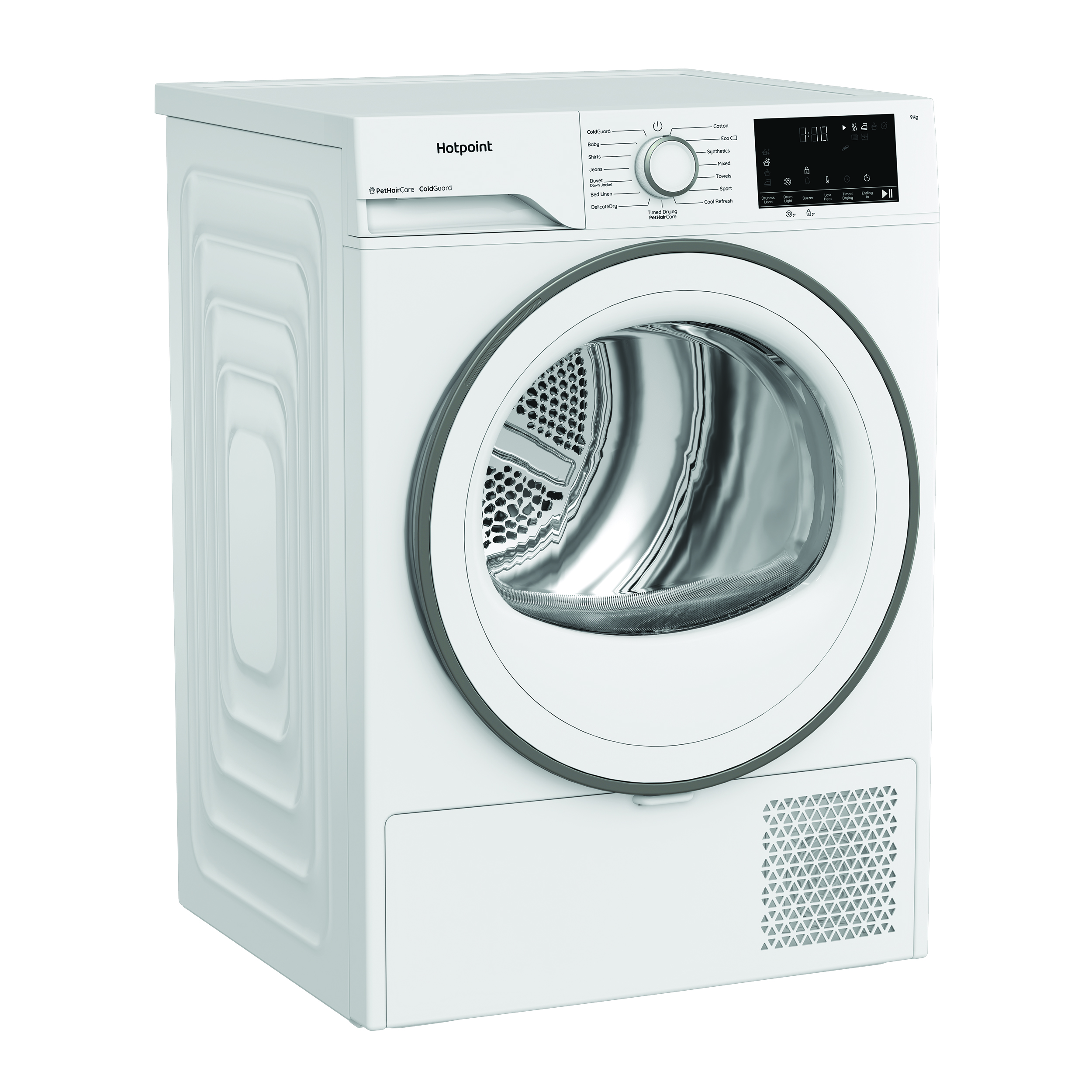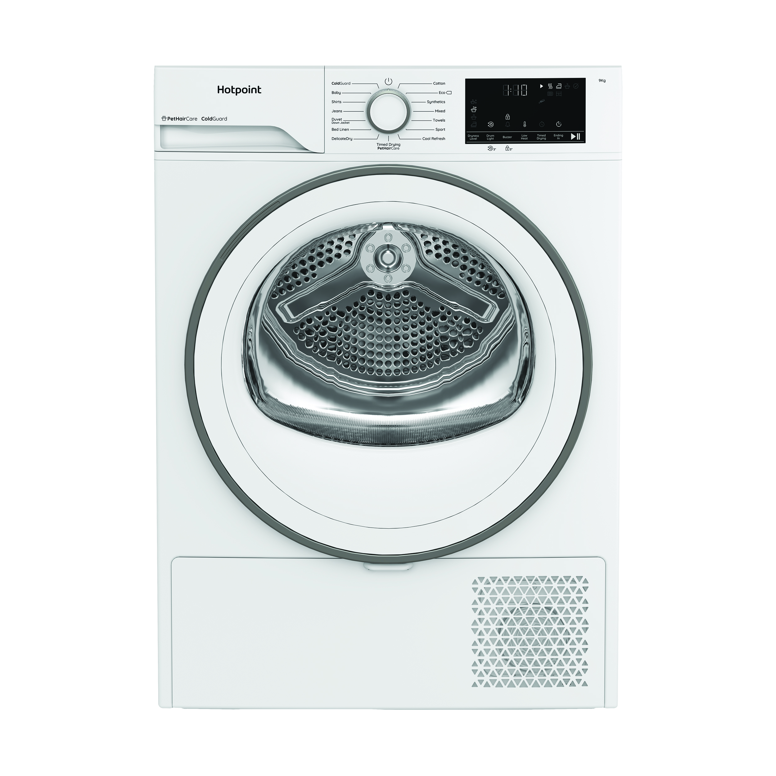 This classic white Hotpoint heat pump tumble dryer makes laundry day easy. With a spacious 9kg drum, you can dry more in one go, making it perfect for busy homes. Thanks to Heat Pump technology, it uses up to 77% less energy* while drying clothes gently at lower temperatures ° great for delicate items and your bills. If pets are part of your family, the PetHairCare cycle will help. Steam relaxes fabrics to lift hair and trap it in the filter, so clothes come out fresh and hair-free. The DelicateDry cycle dries gently at lower temperatures ° helping prevent shrinking and keeping your favourite pieces looking good as new. With the Easy Clean Filter located in the door, keeping your dryer in top shape is no hassle at all. The ColdGaurd programme is designed to work efficiently in temperatures as low as 0°C, allowing you to place your dryer in garages and outbuildings when space in the kitchen is limited. *Compared to condenser tumble dryers of B energy class.