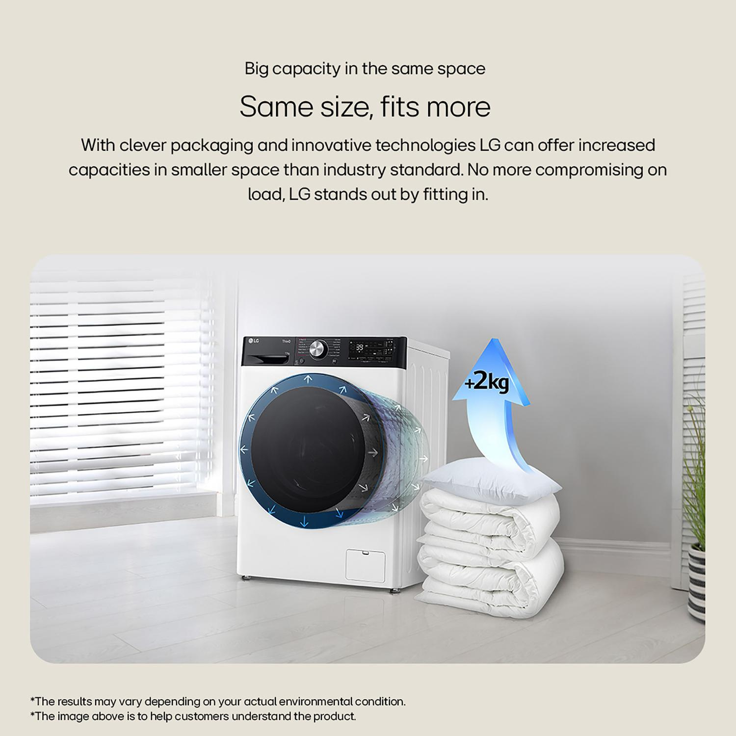 This washing machine is user-friendly, making it suitable for busy families and individuals seeking efficiency. It utilises LG AI Direct Drive, which intelligently detects load and fabric types, offering enhanced care for your clothing with an impressive 18% more fabric protection. With its 6Motion Direct Drive system, it employs six different types of drum movements for a comprehensive clean, catering to various fabric needs.