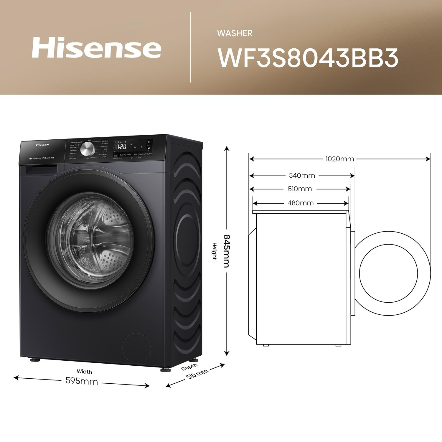 Discover the Hisense WF3S8043BB3 washing machine, designed to handle up to 8kg of laundry with a powerful 1400 RPM spin speed for efficient cleaning and reduced drying time. Its sleek black finish brings a modern touch to any laundry space, combining functionality with style. This model is built for users seeking a reliable appliance that balances capacity and performance.