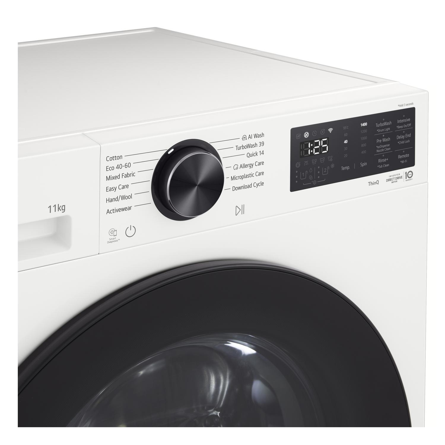 Experience efficient laundry with the LG F4X5011TWB washing machine, featuring an 11kg capacity and a fast 1400 rpm spin speed for thorough cleaning and quick drying. Its sleek white design fits seamlessly into modern homes, combining style with functionality. This model offers a robust wash cycle tailored to handle substantial loads, ensuring convenience for busy households.